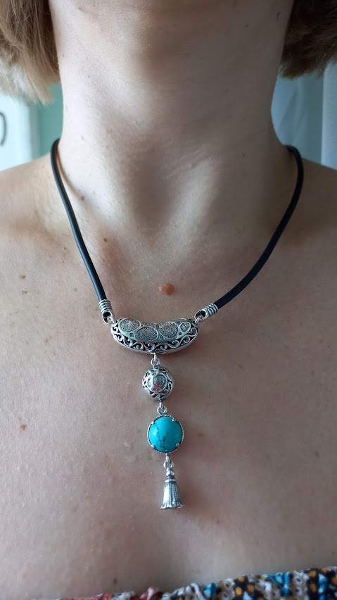 ніжне срібне кольє каучук зі сріблом (14.79 г грамів).довжина 55 см.застібка карабін.ширина ширина каучуку 3 мм.вставка бірюза сітчаста реконструйована пересилання по Україні